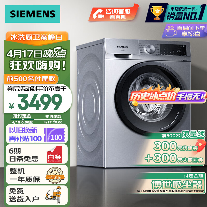 西门子(SIEMENS)10公斤滚筒全自动洗衣机烘干机一体机 蒸汽净化除菌 热风清新 双重净筒智能烘干 X42W价格:4499.00元!