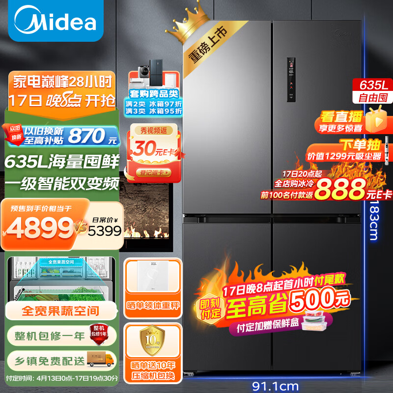 美的(Midea)一级能效双变频十字双开门四开门家用智能冷藏冷冻电冰箱风冷无霜MR-666WSPZE超大容量价格:5899.00元!