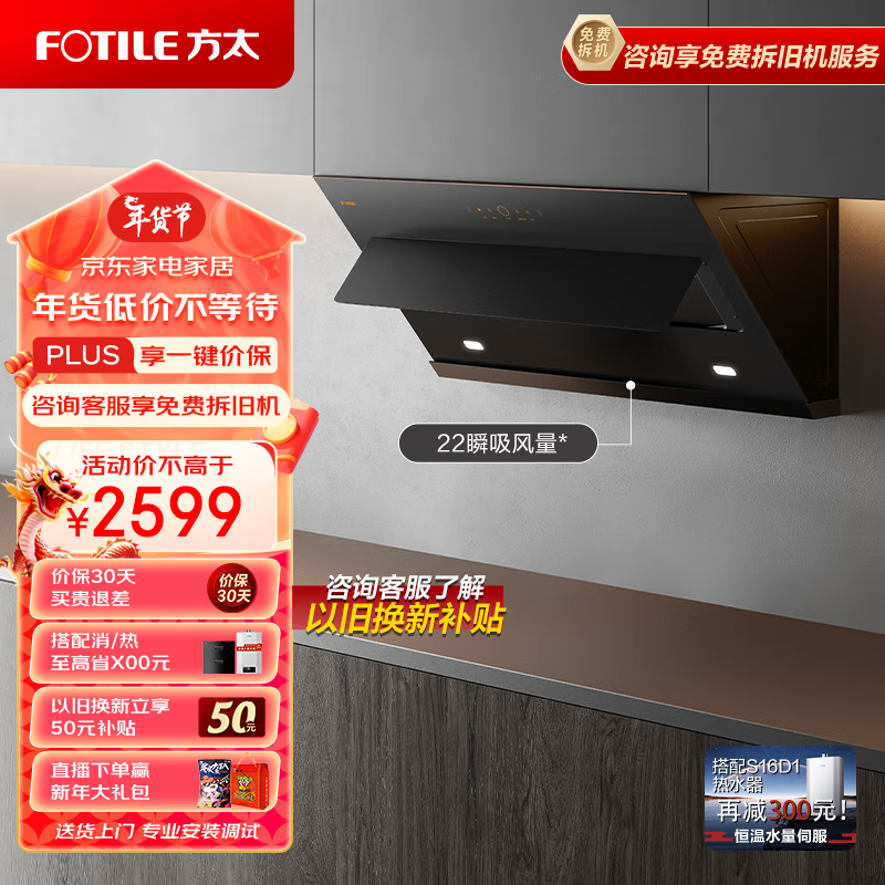 方太家用侧吸式抽油烟机 22瞬吸风量 挥手智控 小尺寸JCD9A价格:2599.00元!
