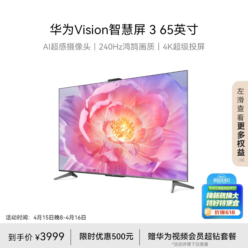 华为Vision智慧屏 3 65英寸 4K超级投屏AI摄像头 240Hz屏超高清智能液晶超薄护眼电视机HD65QINA价格:3999.00元!