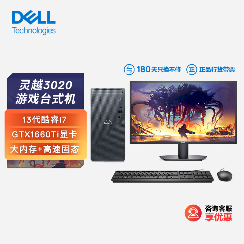 戴尔(DELL)灵越3020 游戏台式电脑主机(酷睿13代i7-13700F 16G 512GSSD GTX1660Ti)27英寸大屏显示器价格:7999.00元!