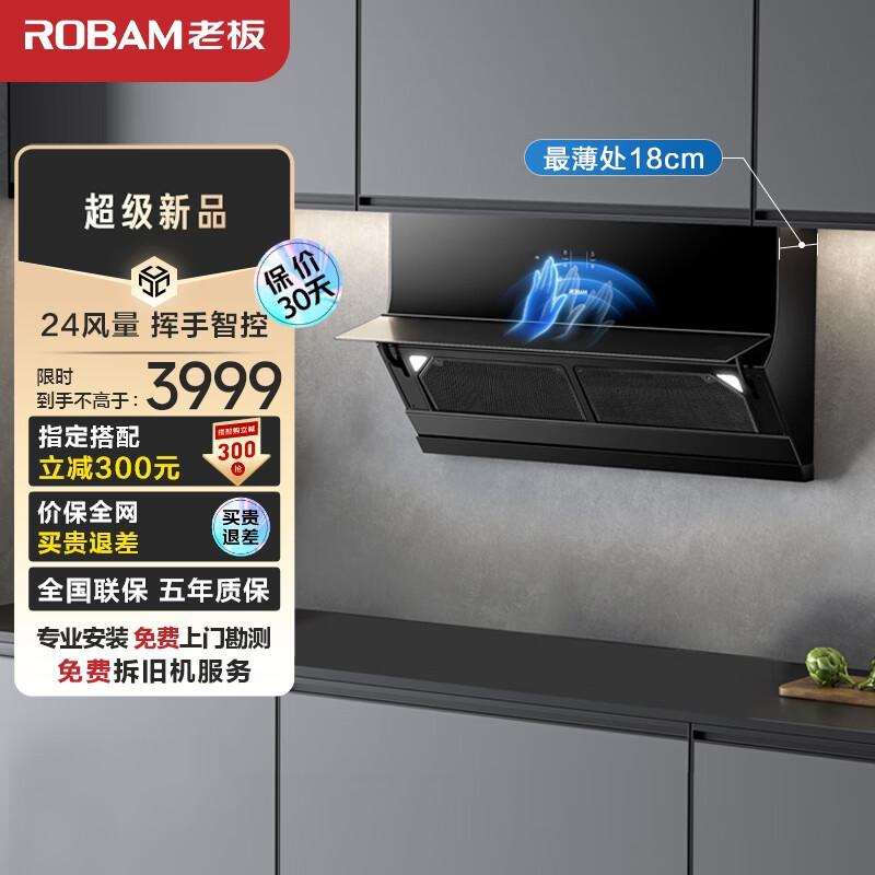 老板(Robam)抽油烟机超薄近吸变频24风量油烟机家用大吸力变频挥手智控低噪以旧换新易洁吸脱排油烟机23A0S价格:3999.00元!