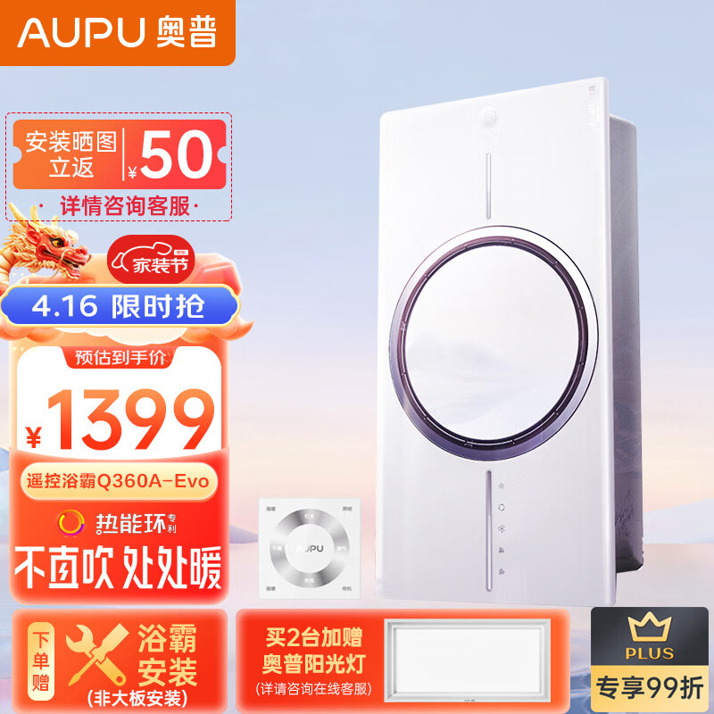 奥普(AUPU)浴霸Q360A-Evo热能环风暖浴霸遥控开关外接照明(非大板安装SKU)价格:1699.00元!