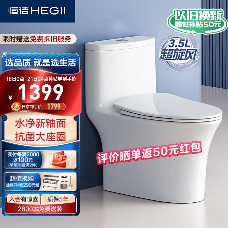 恒洁(HEGII)马桶562 超旋风大冲力抗菌座圈虹吸式家用坐便器HC0562DT-305价格:2059.00元!