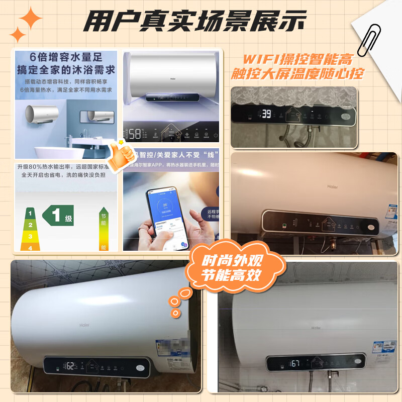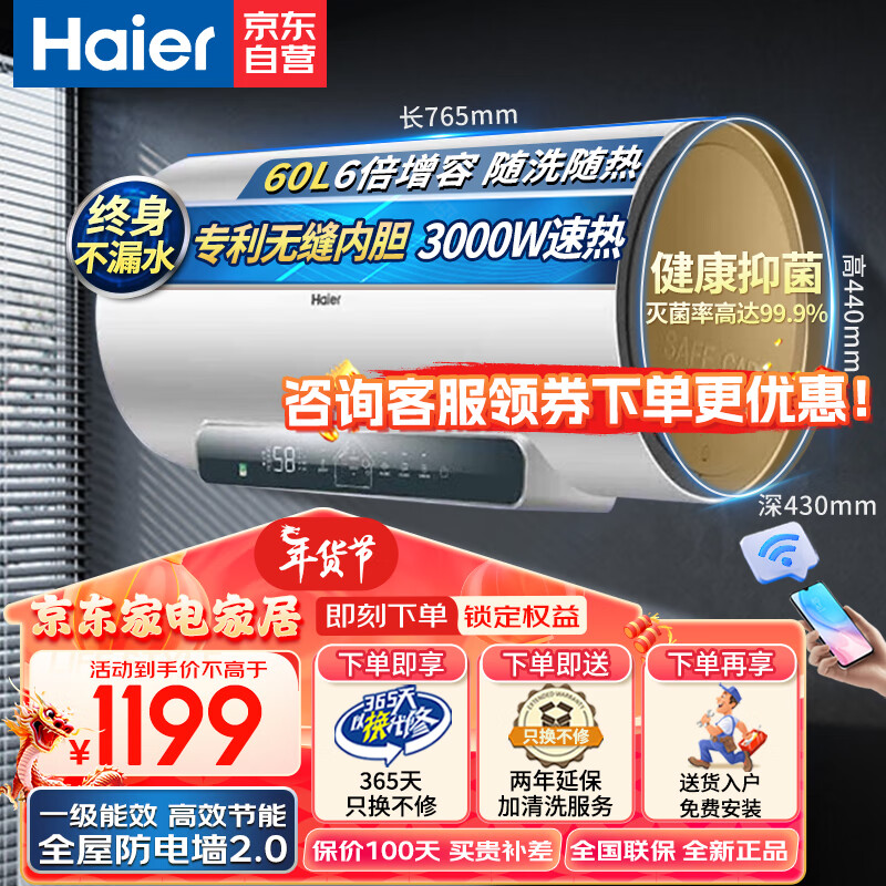 海尔(Haier)电热水器60升家用大容量3000W速热一级能效WIFI远程智控金刚无缝胆储水式6倍增容水量EC6001-JM3U1价格:1199.00元!