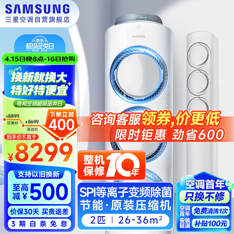三星空调2匹全直流变频离子除菌除湿柜式新三级能效冷暖客厅柜机立式26-36㎡适用以旧换新KFR-50L/EMD3价格:8699.00元!