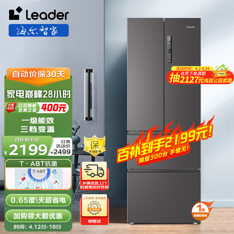 Leader 海尔智家出品342升风冷无霜一级能效双变频变温节能法式四门多门家用电冰箱BCD-342WLLFDD9S9价格:2199.00元!
