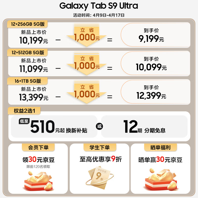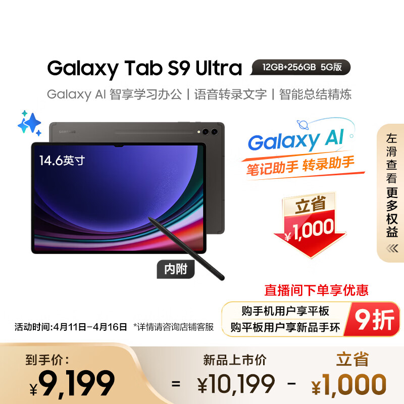 三星(SAMSUNG)S9 Ultra Al智享学习办公平板电脑14.6英寸 120Hz 12G+256GB 5G含Spen AI平板 云影灰价格:9199.00元!