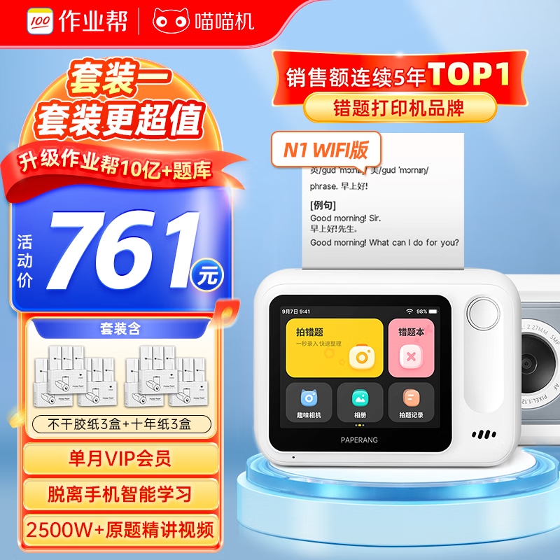 喵喵机N1 作业帮学生错题整理神器家用热敏脱离手机可触屏智能学习错题打印机 WIFI版(套餐一)价格:761.00元!