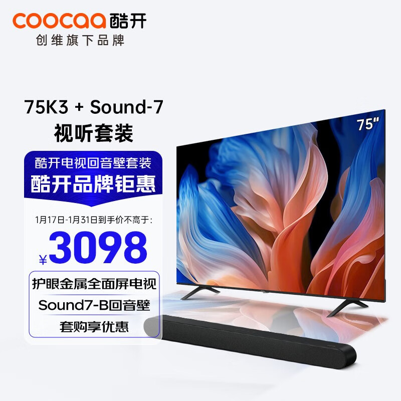 酷开创维K3 75英寸电视 护眼金属屏电视机+Sound-7B木制回音壁 家庭影院KTV 立体环绕DSP数字音响价格:3098.00元!