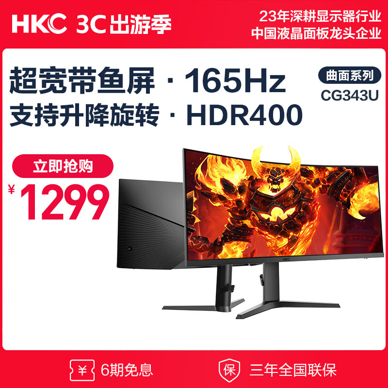 HKC 34英寸21:9带鱼屏 WQHD准4K 165Hz 1ms响应 1000R曲面升降旋转 HDR400 电竞游戏显示器 CG343U价格:1499.00元!