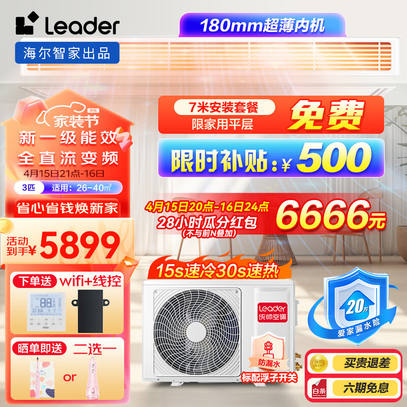 Leader海尔智家出品3匹P元气风管机一拖一级能效中央空调嵌入式全直流变频客厅空调 KFRd-72NW/73ED81TU1价格:5868.00元!