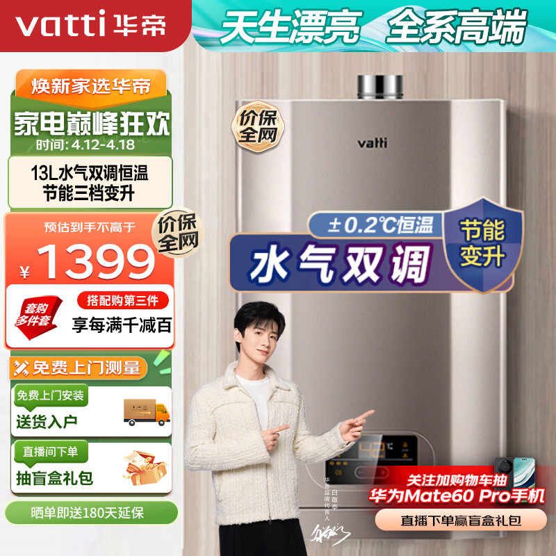 华帝(VATTI)13升燃气热水器 天然气 水气双调 家用即热式热水器 节能变升恒温 i12051-13价格:1399.00元!