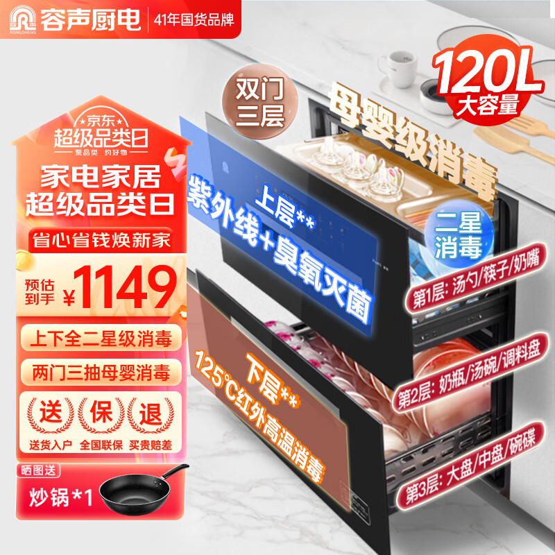 容声(RONGSHENG) 三层二星 消毒柜 嵌入式 家用 消毒碗柜 高温 臭氧 厨房碗筷消毒柜 120L大容量RX03D价格:1149.00元!