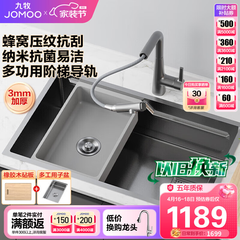 九牧(JOMOO)不锈钢压纹抗刮抗菌变轨水槽大单槽洗菜盆70*45不含龙头06283-9CZ价格:1499.00元!