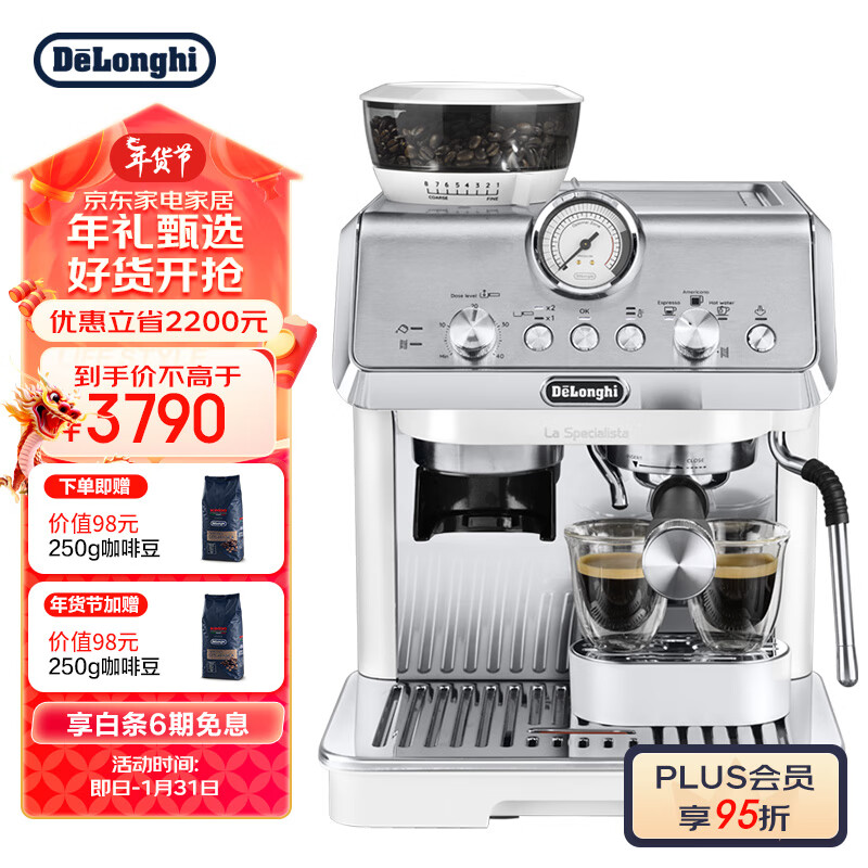 德龙(Delonghi)咖啡机 骑士系列半自动咖啡机 意式家用 泵压萃取 一体式研磨器 小巧机身 EC9155 白色价格:3790.00元!