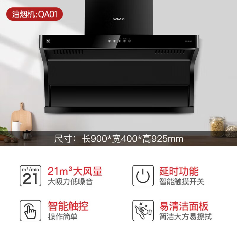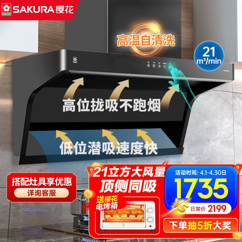 樱花 SAKURA 油烟机顶侧双吸抽油烟机家用抽烟机触控式上下双进风口21立方米大吸力 CXW-280-QA01【7字型顶侧双吸】价格:1735.00元!