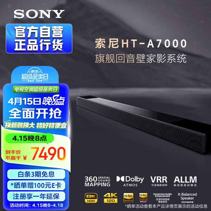 索尼(SONY)HT-A7000 7.1.2 旗舰全景声 回音壁 360智能穹顶 4K/120Hz 无线家庭影院 Soundbar 电视/无线音响价格:7490.00元!