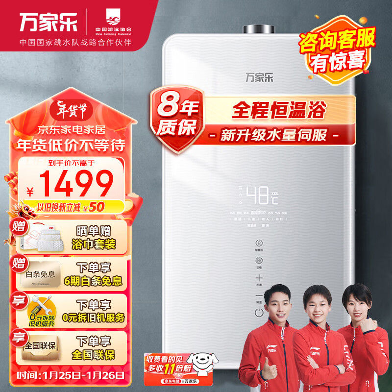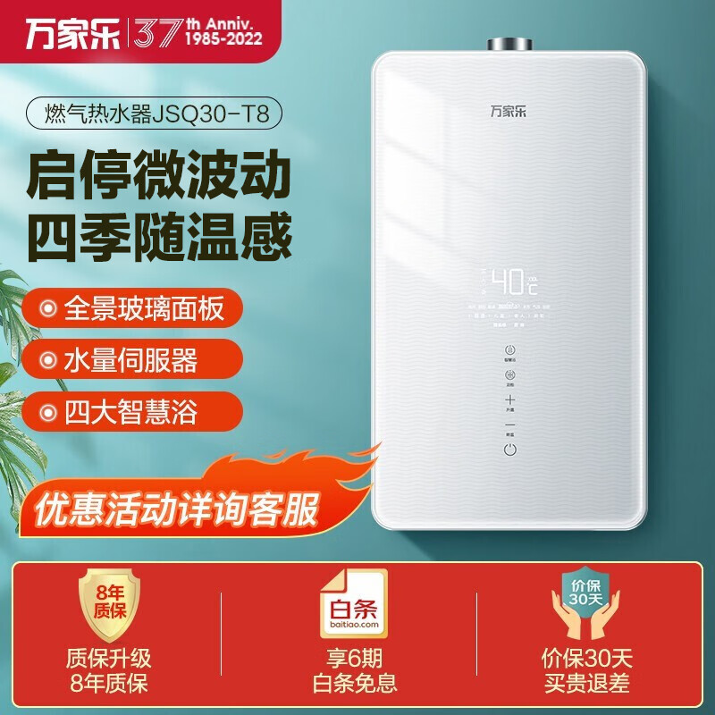 万家乐 16升燃气热水器(天然气)全景屏玻璃面板水量伺服器水温0波动智慧浴智温感JSQ30-T8价格:1499.00元!