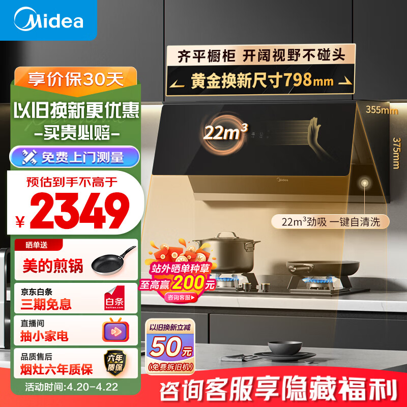 美的(Midea)抽油烟机灶具套装 家用厨房小尺寸侧吸式22吸力挥手自清洁超薄烟机 5kW燃气灶J37+Q230A天然气套装价格:2349.00元!