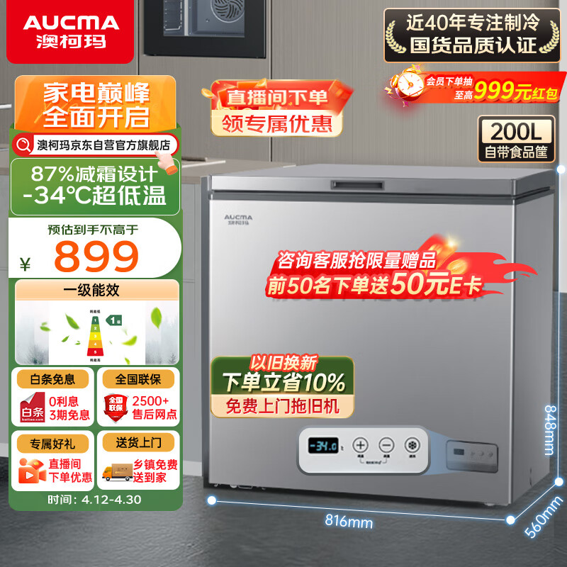 澳柯玛(AUCMA)200升家用冰柜 87%阻霜 商用大容量 冷藏冷冻柜 电脑控温冷柜 一级能效 BC/BD-200DNE以旧换新价格:1049.00元!