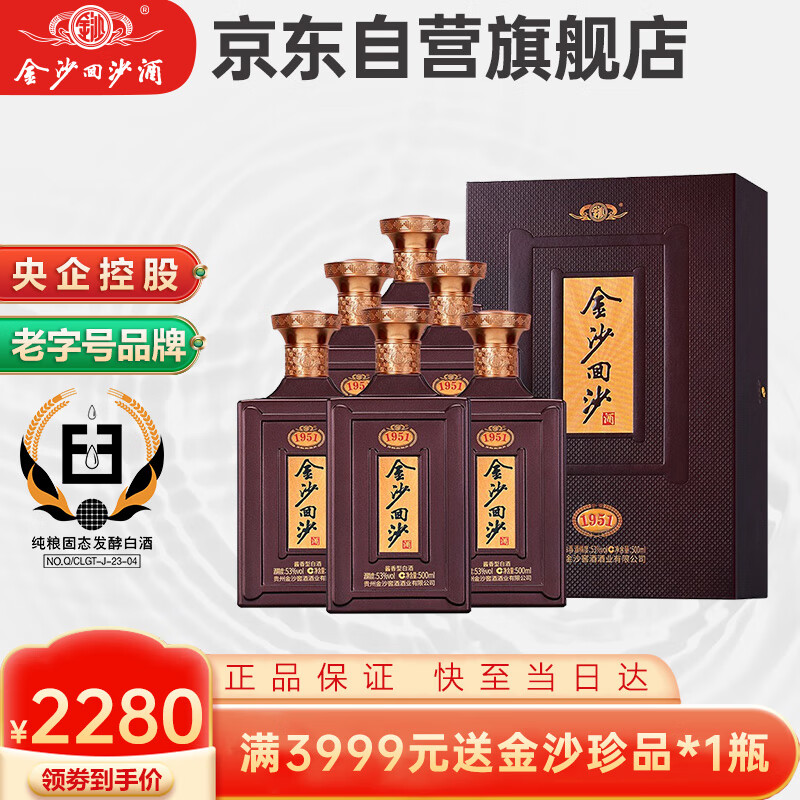金沙回沙酒 纪年酒1951 酱香型白酒 53度 500ml*6瓶 整箱装 纯粮食酒价格:2310.00元!
