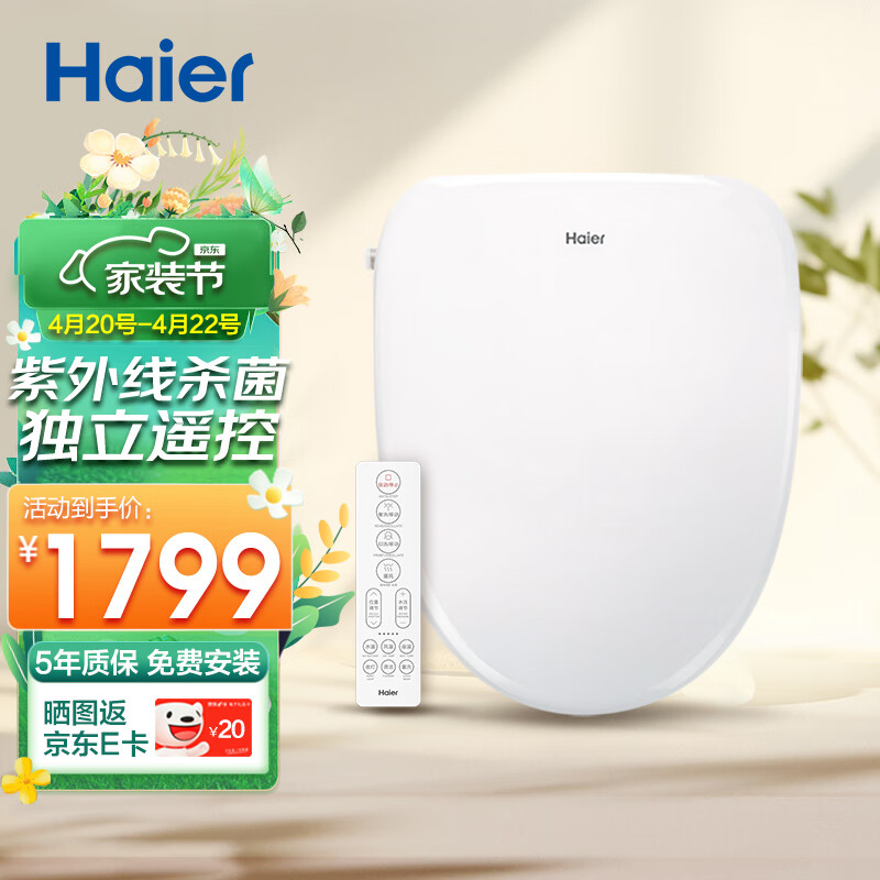 海尔(Haier)智能马桶盖 即热暖风遥控款 紫外线杀菌自动除臭抗菌座圈 H4-5018价格:2299.00元!