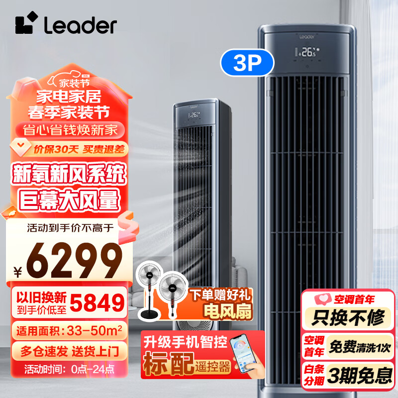 Leader空调海尔出品大3匹新风立式空调 一级能效变频冷暖大风量家用客厅柜机空调以旧换新VDA81[家电]价格:6999.00元!