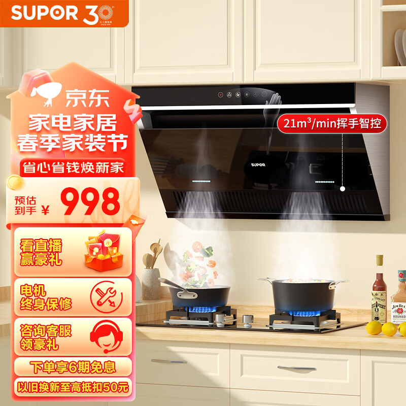 苏泊尔(SUPOR) 抽油烟机侧吸式 21立方大吸力 家用吸油烟机 挥手智控 免拆洗脱排油烟机 DJ2C5单烟机价格:1098.00元!