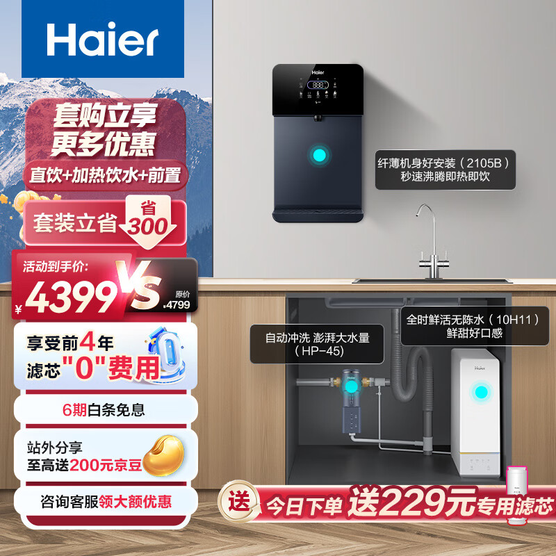 海尔(Haier)鲜活水净水器家用净水机1000G厨下式RO反渗透母婴直饮净水器+前置过滤器+管线机10H11+HP45+D2105B价格:4399.00元!