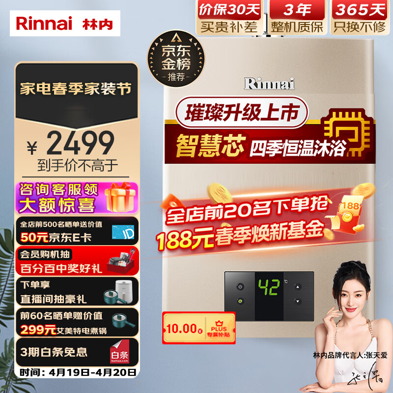 林内(Rinnai)璀璨系列13升燃气热水器 升级智慧芯 水气双调 天然气12T RUS-13QC05(JSQ26-C05)价格:2498.90元!