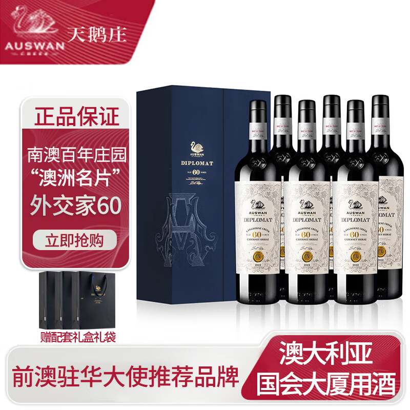 天鹅庄(AUSWAN)澳大利亚原瓶进口红酒 外交家混酿干红葡萄酒6支礼盒价格:6698.00元!
