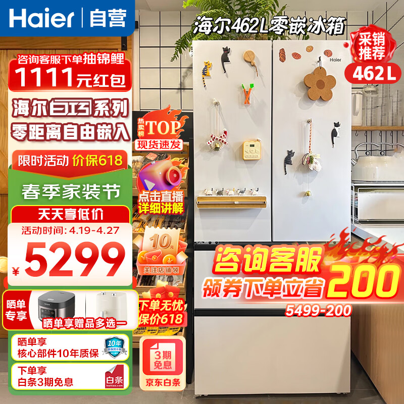 海尔(Haier)冰箱白巧系列462升风冷无霜变频白色法式多门冰箱零距离嵌入全空间保鲜母婴三挡变温黑金净化价格:5499.00元!