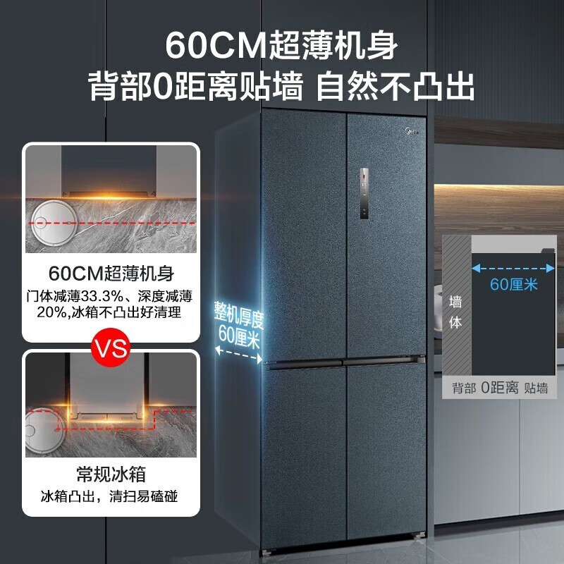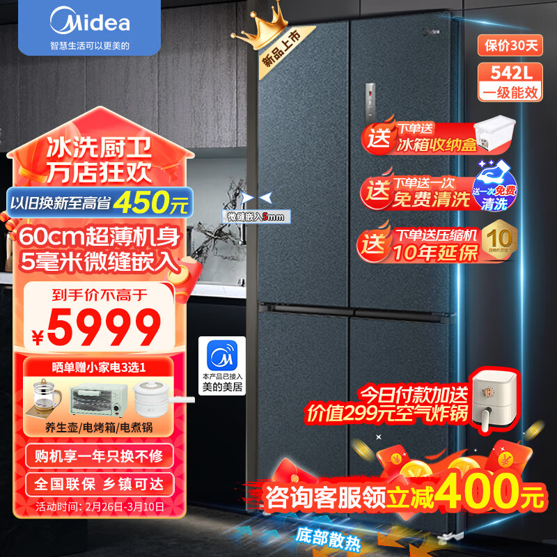 美的(Midea)569十字双开四开门一级能效双变频嵌入式双净味底部散热家用大容量60cm超薄电冰箱MR-569WUSPZE价格:6399.00元!