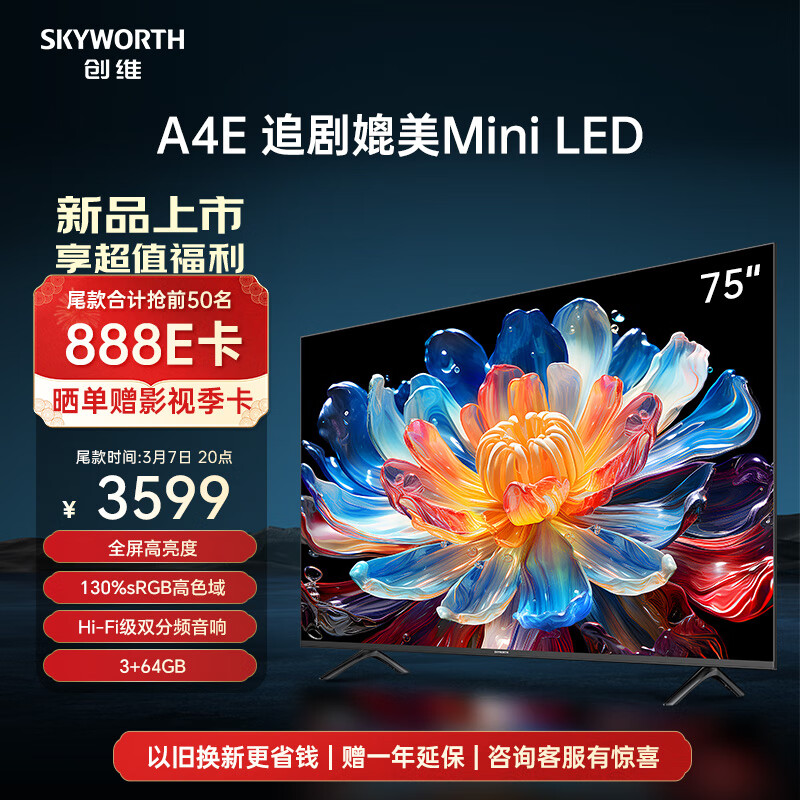创维电视75A4E 75英寸电视机追剧媲美mini led 400nits3+64G智慧屏彩电液晶4K超薄护眼游戏电视价格:3599.00元!