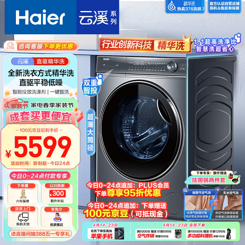 海尔(Haier)滚筒洗衣机全自动 云溪376 洗烘一体机【直驱精华洗XQG100-HBD14376LU1】家用超薄10公斤 以旧换新价格:5699.00元!