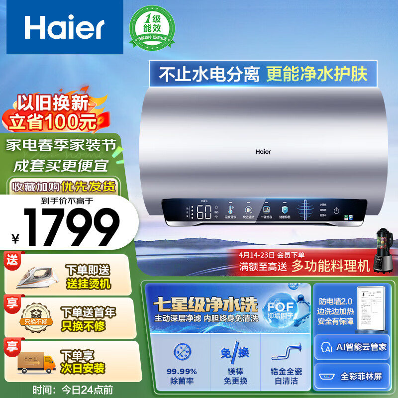 海尔(Haier)60升【金刚无缝胆】美肤净水洗彩屏电热水器家用储水式3300W变频大功率速热一级能效 EC6002-JH7U1价格:1999.00元!