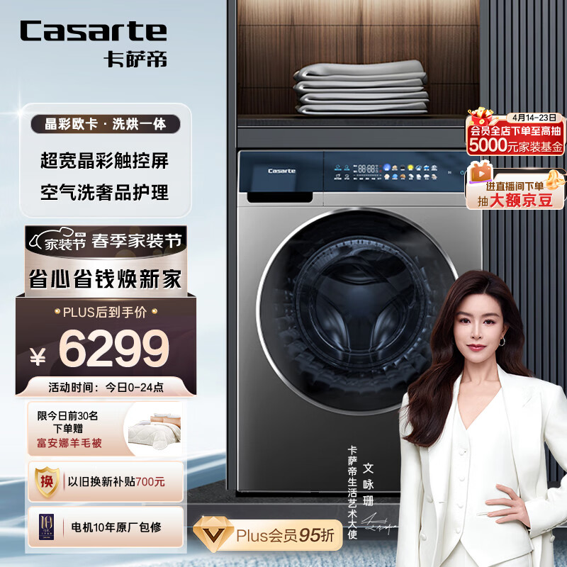 卡萨帝(Casarte)揽光S3滚筒洗衣机全自动 10公斤洗烘一体机 直驱变频防震动 奢护空气洗紫外除菌 晶彩欧卡H10S3CU1价格:6599.00元!