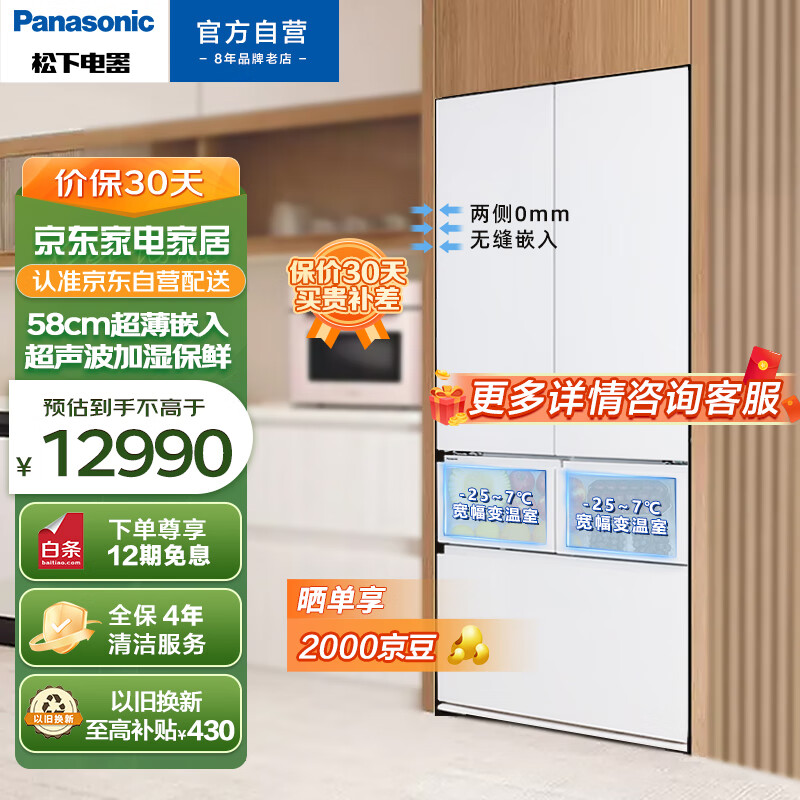 松下(Panasonic)大白PRO 460升家用多门冰箱一级能效五开门大容量580mm超薄嵌入式冰箱NR-JW46BGB-W珍珠白价格:14390.00元!