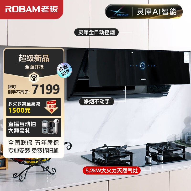 老板(Robam)【灵犀烟灶联动升级】侧吸油烟机26风量变频抽油烟机家用燃气灶具烟灶套装29A9S+57B6D(天然气)价格:7199.00元!