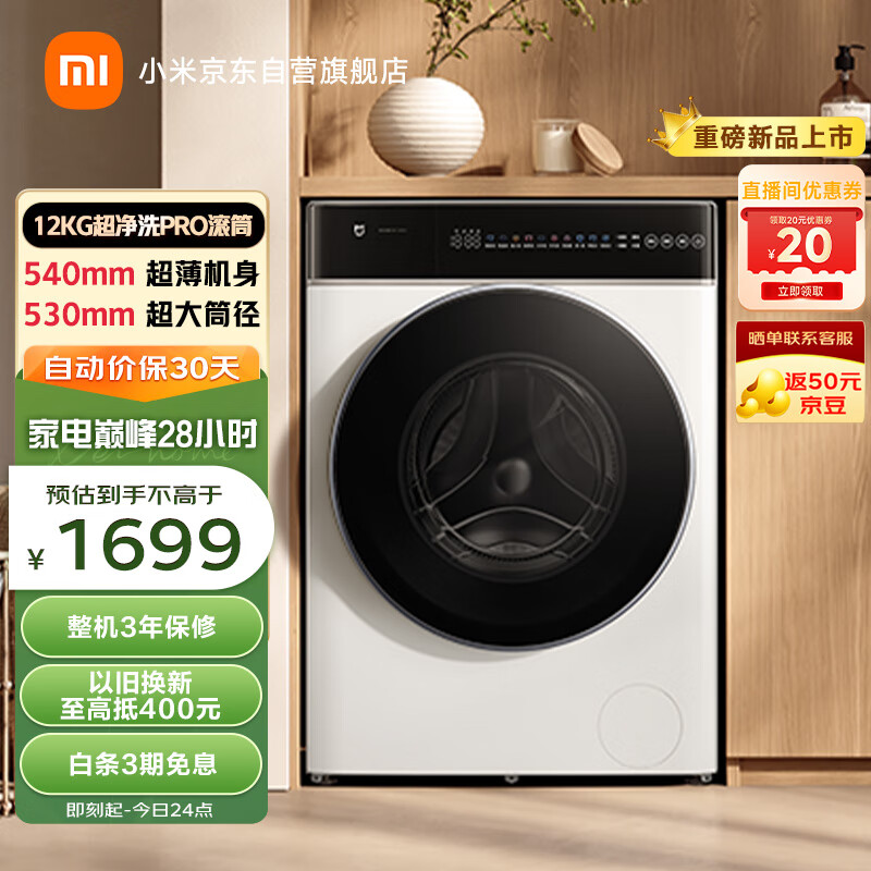 米家小米12公斤超大容量超净洗pro滚筒洗衣机 530mm超大筒径超薄机身1.1高洗净比 XQG120MJ301价格:1699.00元!