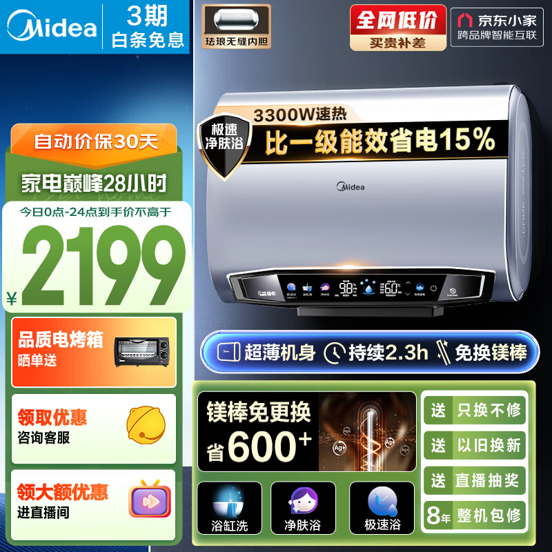 美的(Midea)60升玲珑超薄双胆扁桶电热水器3300W变频 镁棒免换12倍增容一级能效F6032-UD(HE)京东小家价格:2399.00元!