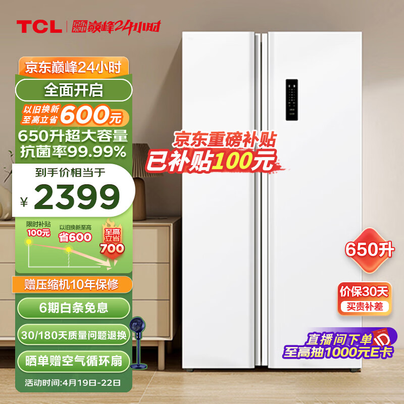 TCL650升T5超大容量对开双开门多门白色冰箱一级能效 风冷无霜 一体双变频 家用电冰箱R650T5-S芭蕾白价格:2399.00元!