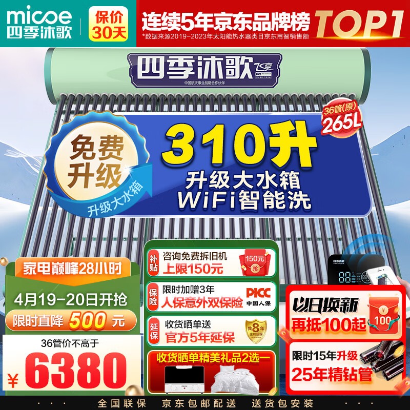 四季沐歌(MICOE)飞享WiFi太阳能热水器家用光电两用自动上水 预约电加热 水温水位显示 一级能效 上门安装36管265L价格:6880.00元!