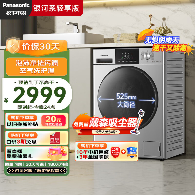 松下(Panasonic)滚筒洗衣机全自动超薄全嵌【银河系轻享版】10公斤 洗烘一体 泡沫净祛渍 除菌XQG100-EG13S价格:2999.00元!