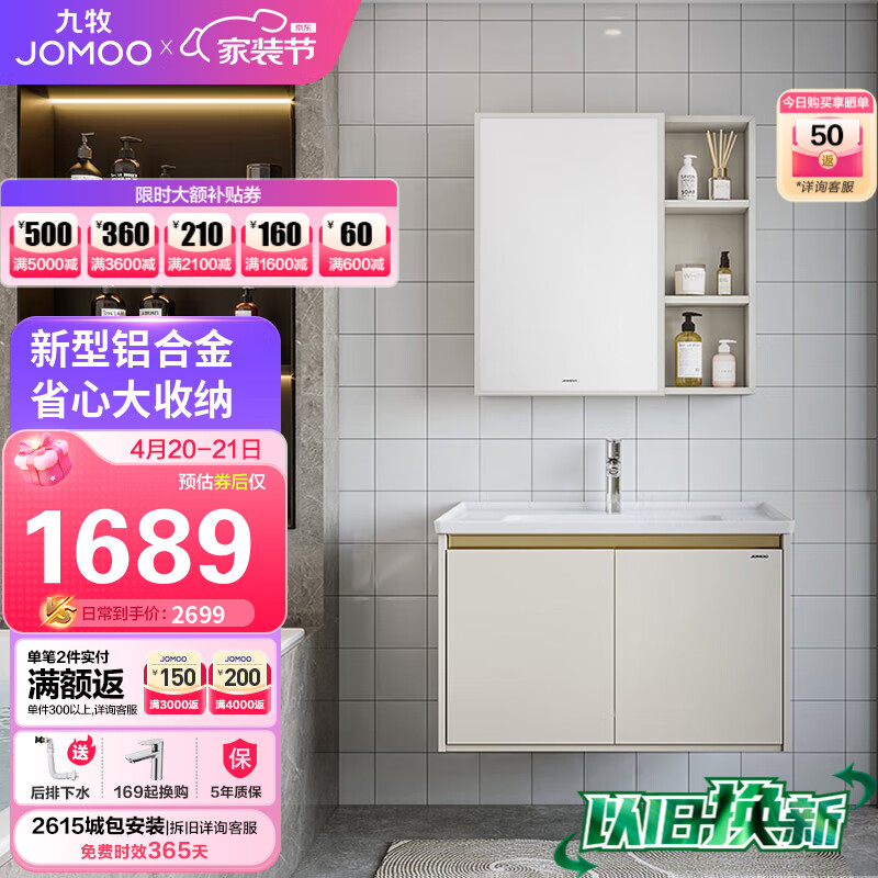 九牧(JOMOO)浴室柜 陶瓷一体盆铝合金抗菌悬挂组合柜海湾灰80cm A2706-716P-1价格:2249.00元!