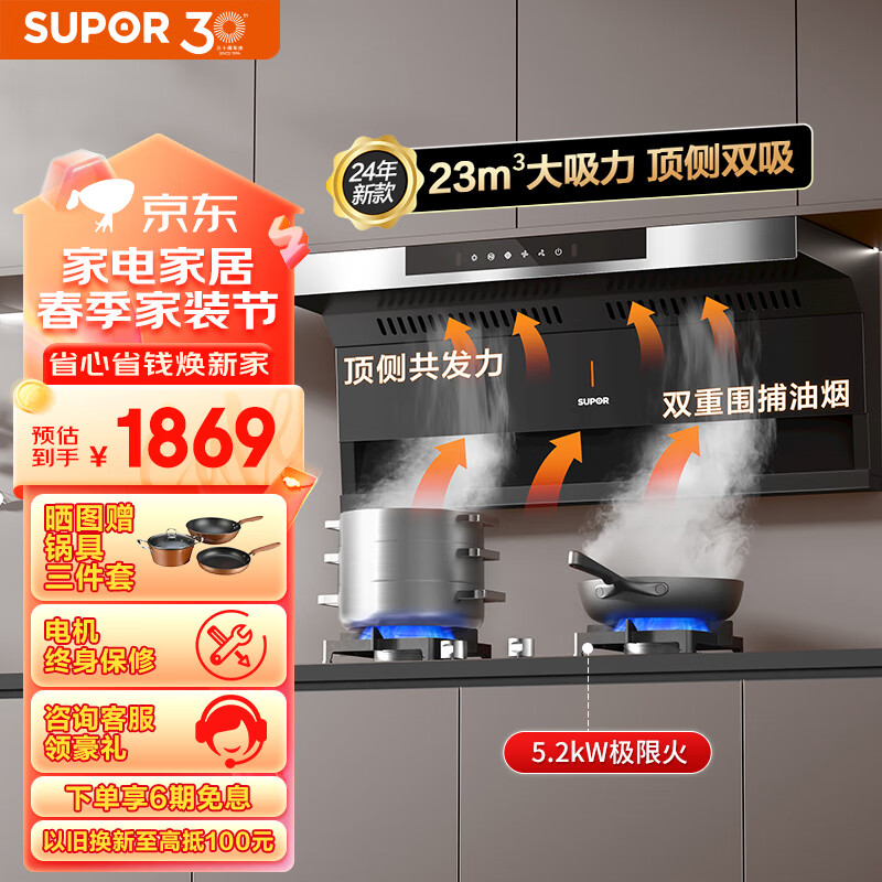 苏泊尔(SUPOR)抽油烟机 顶侧双吸7字型烟灶套装23立方挥手免拆洗家用烟机燃气灶具套装DL11+DB27天价格:1869.00元!