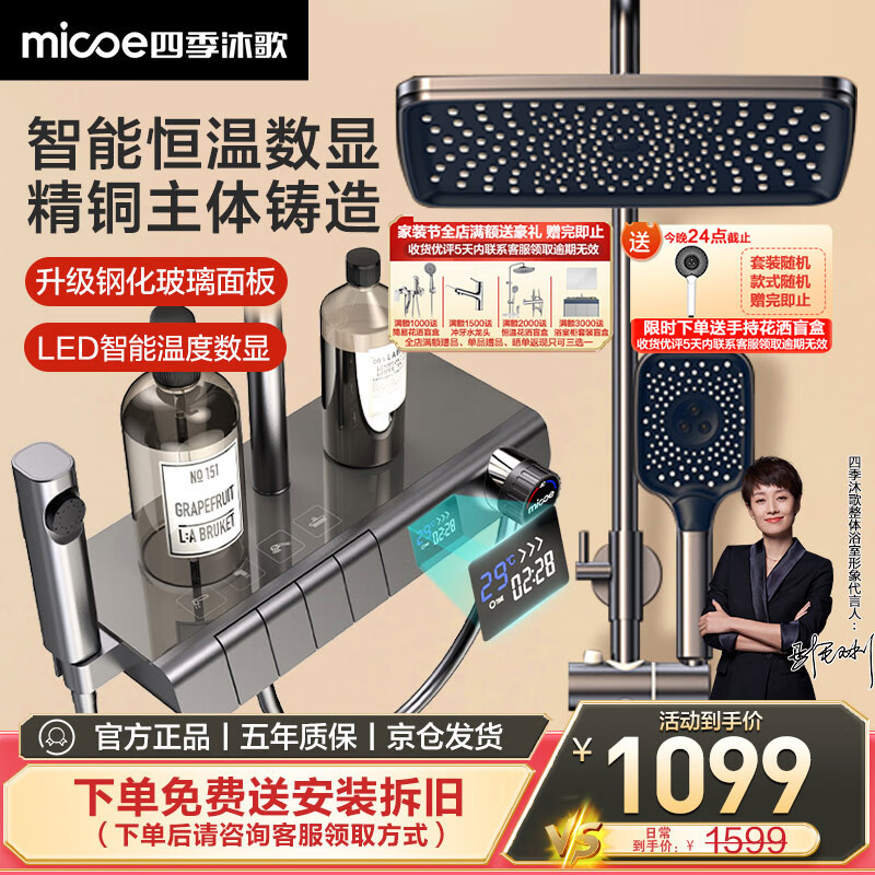 四季沐歌(MICOE)恒温数显淋浴花洒套装 枪灰琴键钢化玻璃置物增压精铜淋浴器全套价格:1599.00元!
