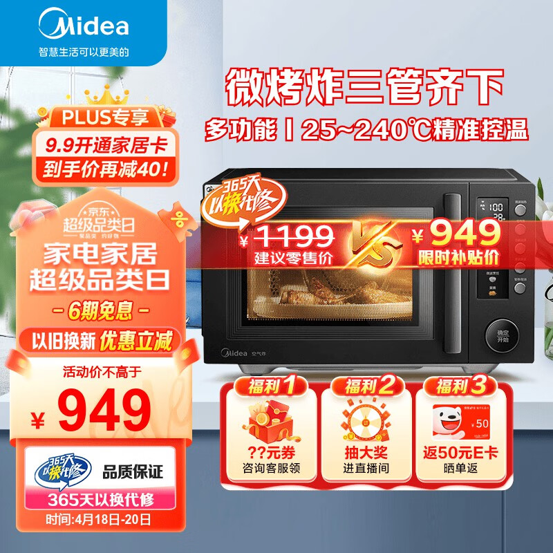 美的(Midea)空气炸 微波炉烤箱一体机 无油低脂大功率 8合一APP智能变频 不锈钢内胆(PC23F3W)价格:949.00元!