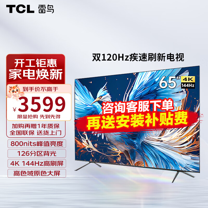 TCL 雷鸟 65英寸 4K超高清 智能电视 4+64GB 144Hz高刷游戏 液晶平板电视机价格:3599.00元!